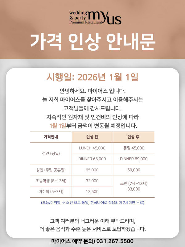 [25년 4월 1일 부터] 가격 인상 안내문 부득이하게 원재료비 및 인건비의 지속적인 상승으로 인해 4월 1일부터 가격 인상을 하게 되었습니다. 고객 여러분의 이해를 부탁드리며, 앞으로도 더 좋은 음식과 수준 높은 서비스로 보답하는 마이어스가 되겠습니다.… 2025.03.14 MORE 마이어스 연회장 새단장 리뉴얼 오픈 더욱 더 쾌적하고 한층 더 고급진 마이어스 리뉴얼 연회장 공개!! 이제 새로운 컨셉, 새로운 무드의 연회장에서 우리아이 돌준비 하세요!… 2024.03.12 MORE 1