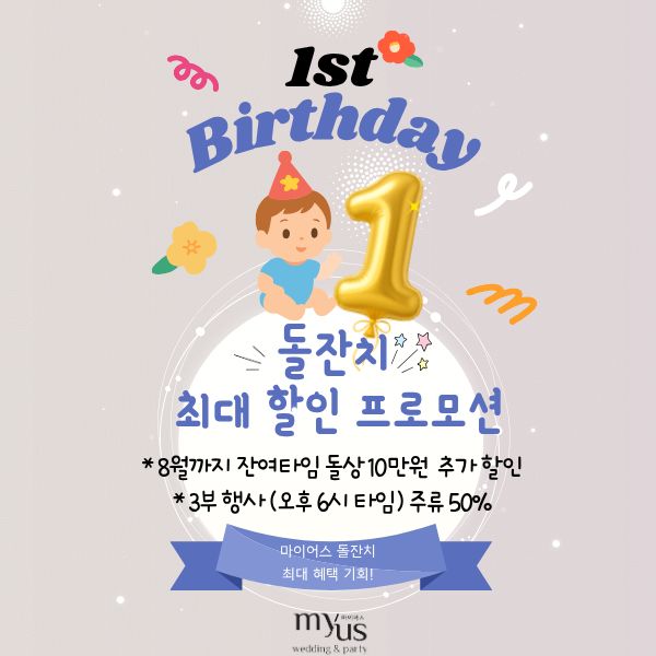 돌잔치 최대 할인 프로모션 진행 중 *8월까지 잔여 타임 예약 시 돌상 10만원 추가 할인 *3부 행사 (오후 6시 타임) 진행 시 주류 50% 할인… 2026.04.07 MORE 2026 마이어스 금요일(런치/디너) 뷔페 할인 금요일엔 마이어스 프리미엄 뷔페 최대 30% 할인 ※ 점심 30% 할인 45,000원 → 31,500원 ※ 저녁 20% 할인 69,000원 → 55,200원… 2026.03.17 MORE [26년 1월 1일 부터] 가격 인상 안내문 부득이하게 원재료비 및 인건비의 지속적인 상승으로 인해 4월 1일부터 가격 인상을 하게 되었습니다. 고객 여러분의 이해를 부탁드리며, 앞으로도 더 좋은 음식과 수준 높은 서비스로 보답하는 마이어스가 되겠습니다.… 2025.03.14 MORE 마이어스 연회장 새단장 리뉴얼 오픈 더욱 더 쾌적하고 한층 더 고급진 마이어스 리뉴얼 연회장 공개!! 이제 새로운 컨셉, 새로운 무드의 연회장에서 우리아이 돌준비 하세요!… 2024.03.12 MORE 1