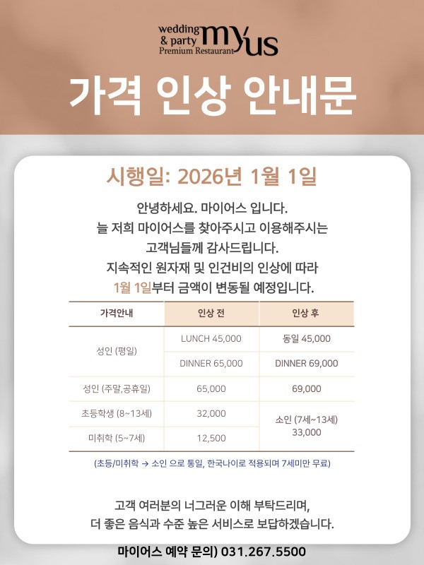 [25년 4월 1일 부터] 가격 인상 안내문 마이어스 웨딩&파티 2025.03.14 572 부득이하게 원재료비 및 인건비의 지속적인 상승으로 인해 26년1월1일부터 가격 인상을 하게 되었습니다.고객 여러분의 이해를 부탁드리며, 앞으로도 더 좋은 음식과 수준 높은 서비스로 보답하는 마이어스가 되겠습니다. 목록 이전글 이전글이 없습니다. 다음글 마이어스 연회장 새단장 리뉴얼 오픈
