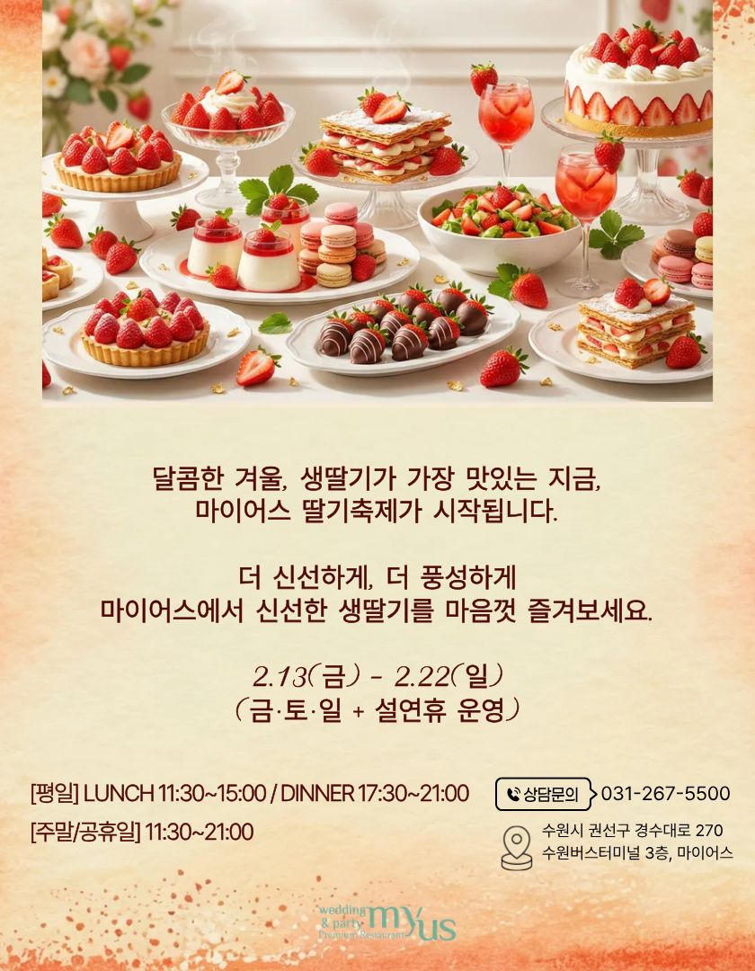 이벤트 상세 혜택 2026 마이어스 딸기축제 기다리던 생딸기 시즌 OPEN! ▶마이어스 딸기축제◀ 이벤트 기간 : 2026/01/20 ~ 2026/02/22 TEL : 031-267-5500 드디어 기다리고 기다리던 생딸기 폭탄의 계절이 돌아왔습니다! 막바지 겨울, 마이어스에서 이번에는 더 맛있게! 더 다양하게! 신선한 생딸기를 마음껏 즐겨보세요. ● 기간 2026년 2월 13일(금) ~ 2월 22일(일) ※ 영업일만 진행 (금/토/일 + 설연휴) 생딸기 가득한 마이어스로 초대합니다! 이벤트 혜택 예약문의) 031-267-5500(내선2번) 이벤트 기간 2026/01/20 ~ 2026/02/22 목록 이전 이벤트 2026년 설 연휴 영업 안내 다음 이벤트 2027년 웨딩