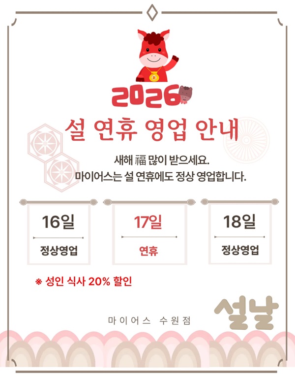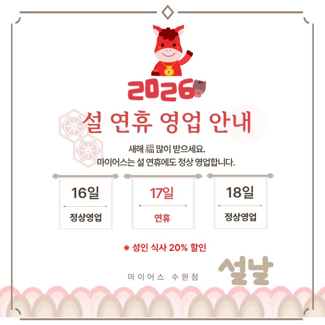 이벤트 상세 혜택 2026년 설 연휴 영업 안내 2026년 설 연휴 영업 안내 이벤트 기간 : 2026/01/27 ~ 2026/02/18 TEL : 031-267-5500 안녕하세요, 마이어스 수원점입니다.민족의 대명절 설을 맞아 고객 여러분 모두 새해 福 많이 받으시길 바랍니다. 마이어스는 설 연휴 기간에도 아래와 같이 영업합니다. §영업 일정 안내§2월 16일(월) : 정상영업 2월 17일(화) : 휴무 2월 18일(수) : 정상영업 §이벤트 안내§ 설 연휴 기간 성인 식사 20% 할인 연휴 기간에도 많은 방문 부탁드리며,가족·지인과 함께 따뜻한 시간 보내세요 ?? 감사합니다. 마이어스 수원점 이벤트 혜택 성인 식사 20% 할인 이벤트 기간 2026/01/27 ~ 2026/02/18 이벤트 조건 설 연휴 기간 방문하시는 누구나 목록 이전 이벤트 이전 이벤트가 없습니다. 다음 이벤트 2026 마이어스 딸기축제